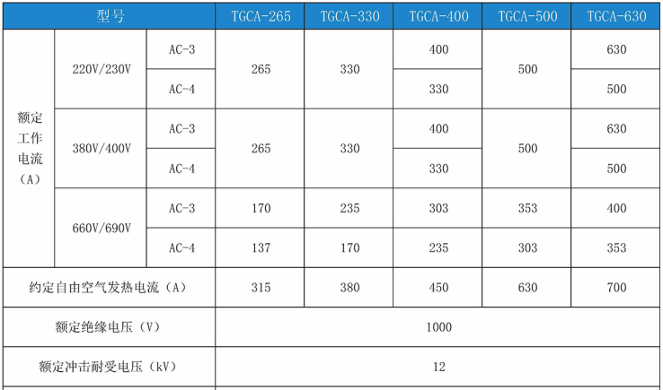 TGCA系列交流接触器(以下简称接触器),主要用于交流50Hz或(50/60Hz),额定工作电压至690V,在AC-3使用类别下额定工作电压380V时,额定工作电流至630A的电力系统中供远距离接通和分断电路之用。并可与适当的热过载继电器组成电磁起动器,以保护可能发生过负荷的电路。接触器适宜于频繁的起动和控制交流电动机。